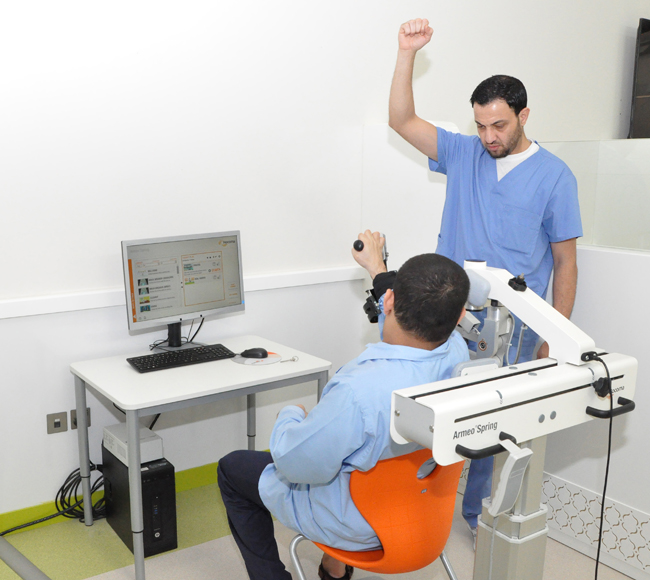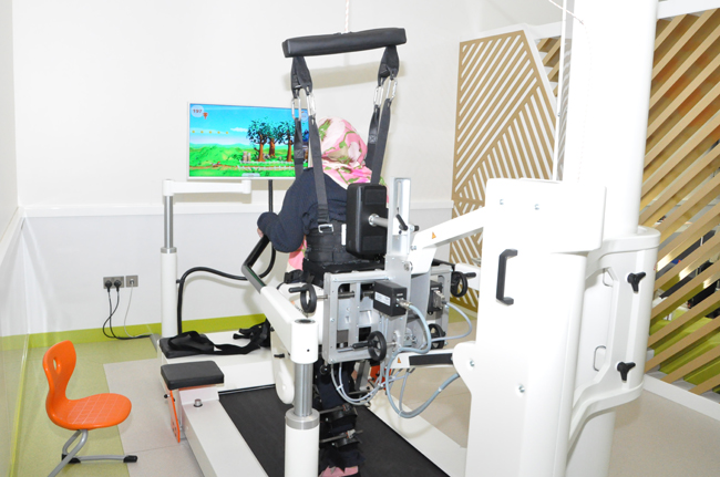 إحدى عشر جهاز اً بمختبر التأهيل الذكي بالمؤسسة، وجهاز تدريب المشي " اللوكومات " الروبوتي بمركز العين