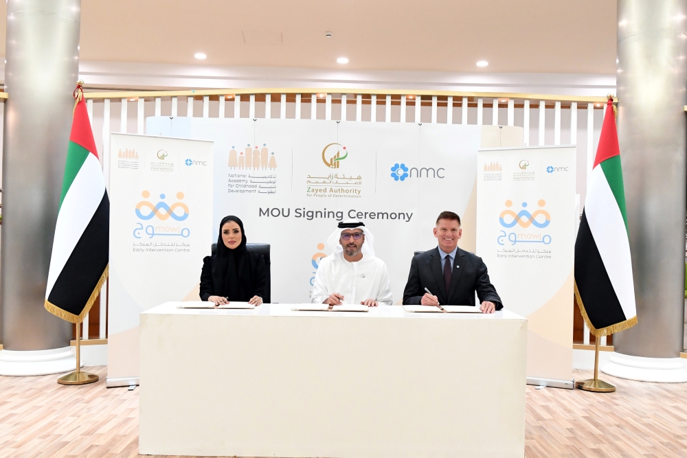 دشنت هيئة زايد لأصحاب الهمم مشروع "موج – مركز التدخل المبكر"، بالتزامن مع توقيعها إتفاقية شراكة إستراتيجية ثلاثية مع الأكاديمية الوطنية لتنمية الطفولة وشركة رويال NMC استيكو ليمتد، لتطوير نموذج متقدم يجمع بين الخدمات الصحية والتأهيلية والدعم الأسري ضمن منظومة موحدة .