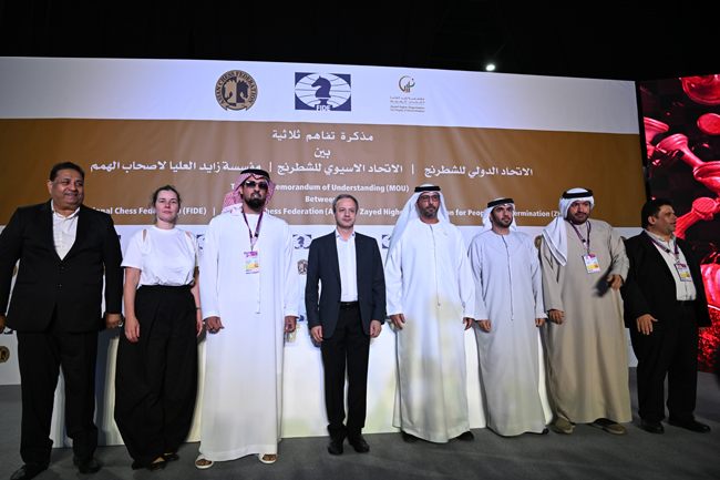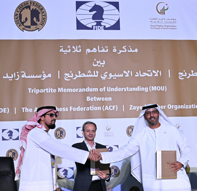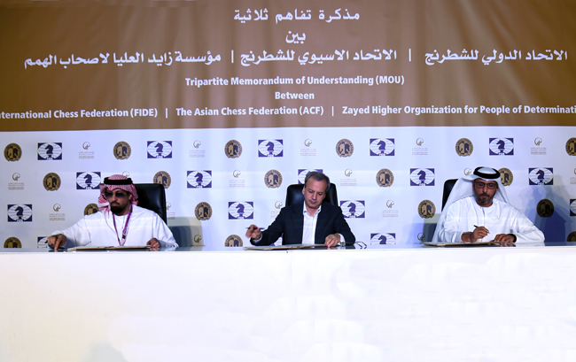 Zayed Higher Organization for People of Determination signed a tripartite memorandum of understanding with the International Chess Federation and the Asian Chess Federation. The aim is to establish, support, and develop the sport of chess for individuals with autism spectrum disorder affiliated with the organization
