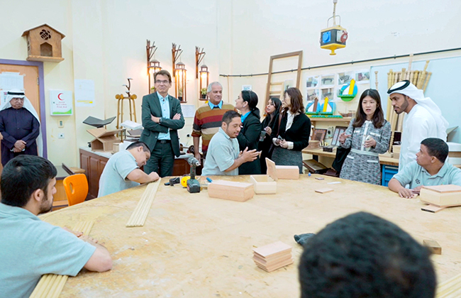 The field visit began at "Beehive Café" to familiarize the delegation with the first-of-its-kind project in the UAE, a cafe run by individuals with disabilities. The cafe not only serves specialty coffee but also provides technical training to rehabilitate people with disabilities, enabling them to obtain internationally accredited certification in the field of coffee making. The café has been designated as an international training center for people with disabilities.