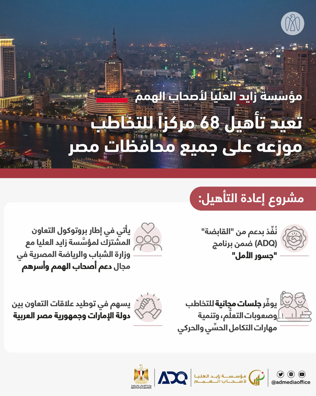 Supported by Abu Dhabi Developmental Holding Company (ADQ), the project is part of a joint cooperation protocol between ZHO and the Egyptian Ministry of Youth and Sports (EMYS) in the field of supporting families of People of Determination as part of the Bridges of Hope programme. The project was completed thanks to the support of all Egyptian bodies serving People of Determination in Egypt.